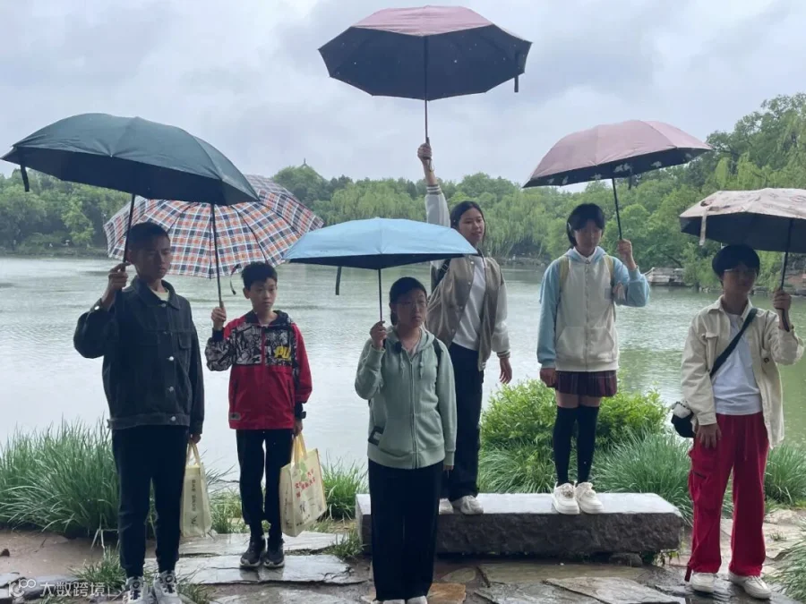 交流之后,翁城小诗人们漫步在雨中的北大校园,在未名湖畔读诗,在博雅塔下走过,看到在水上划出水痕的鸭子,看到树林里并不怕人的鸟儿。在这个满怀诗意的校园,仿佛置身于诗歌的海洋,每一步都踏在了诗行之上。雨中的北大,更添了几分朦胧与梦幻,让小诗人们的心中充满了无限的遐想与憧憬。