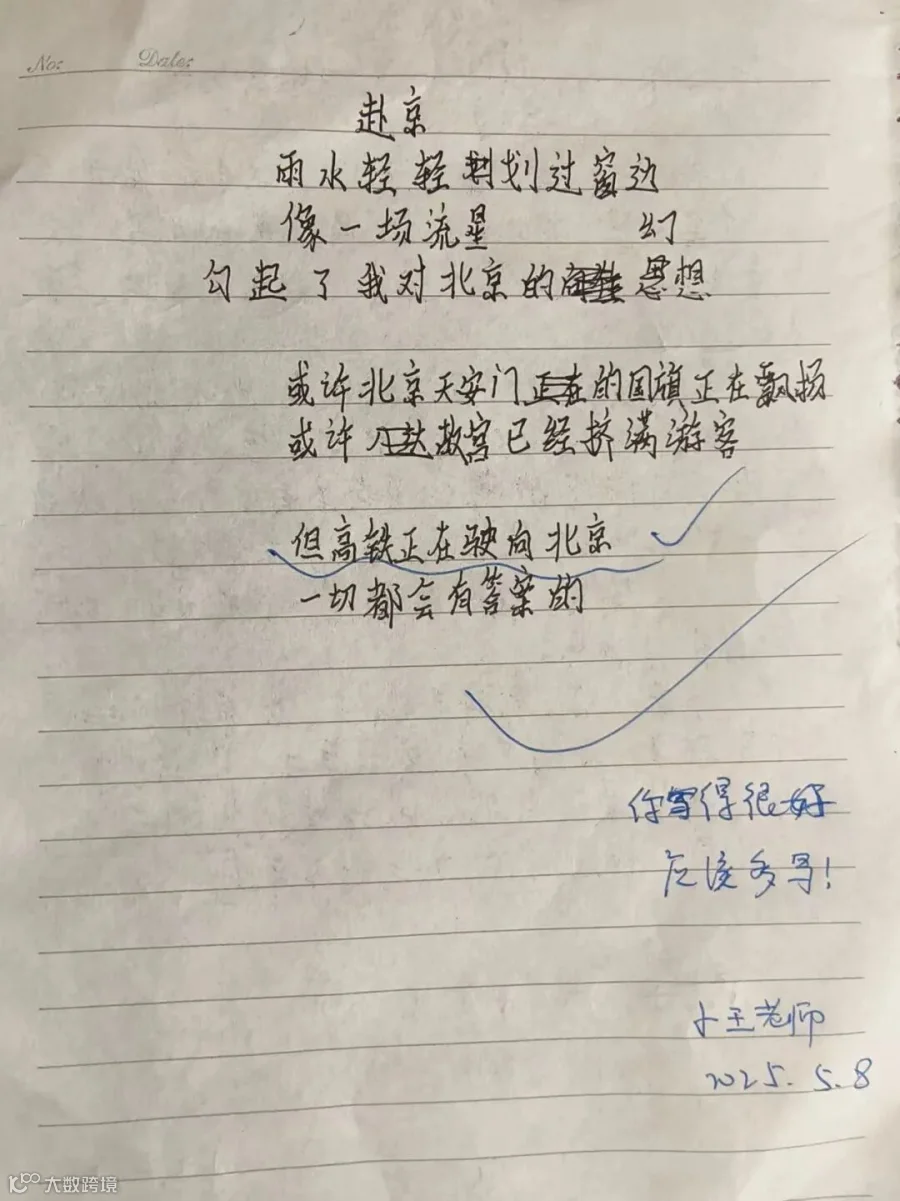 5月8日,翁城小诗人们踏上复兴号列车,带着翁城孩子的诗前往北京。从南到北,窗外的景色不断变换,从起起伏伏的山地丘陵到辽远广阔的平原,历时将近10个小时,终于抵达了北京。
