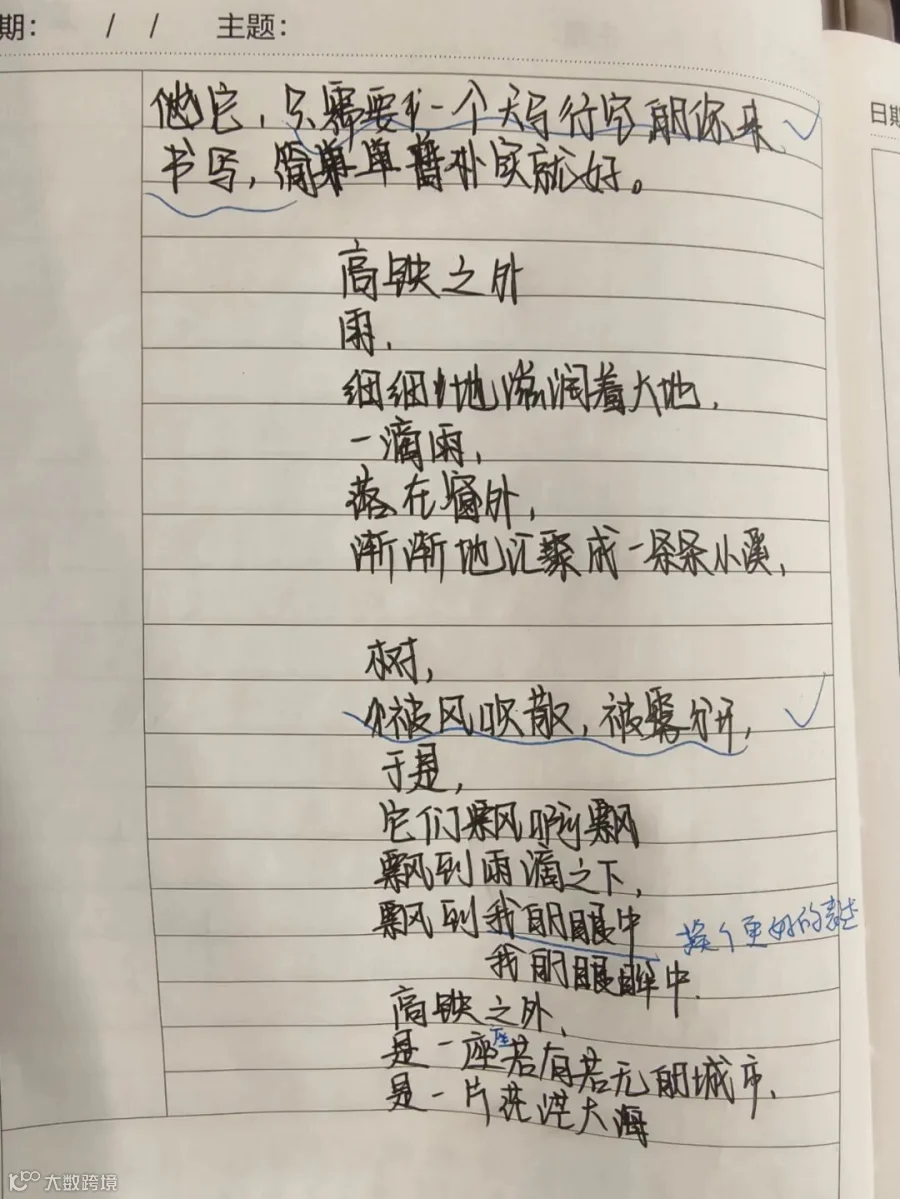 在列车上,小诗人们回忆起自己与诗歌的故事,展望着自己这趟北京之旅。“在高铁里,我兴高采烈,或许是因为第一次坐高铁,但回忆起来,我也是因为诗歌来的。”小诗人们用诗歌记录下自己的沿途所见。“树/被风吹散,被雾分开/于是它们飘啊飘/飘到雨滴之下/飘到我的眼眸中”。