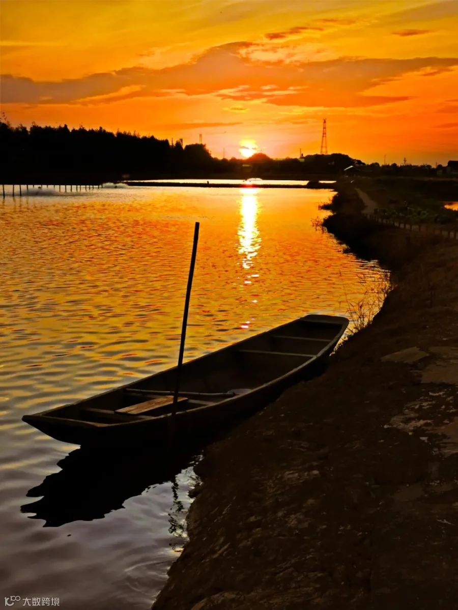 暮色在天地间缓缓倾倒,一叶扁舟斜倚岸畔,水面抻开一匹鎏金绸缎,波纹细碎如时间褶皱,把整座天空的绚烂都缝进粼粼经纬。