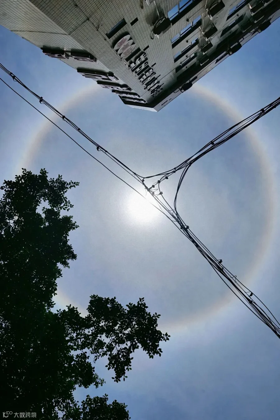 仰视视角下,日晕如天穹之冠,环绕太阳,光晕通透,静静地悬挂在蔚蓝的天空中。
