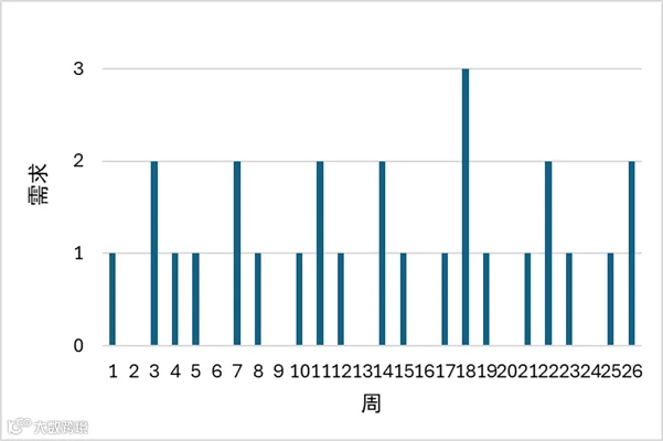 接着,我让DeepSeek“请帮我找一段需求历史,比如过去13周或26周,每周的需求历史列出来。该需求历史符合泊松分布”。DeepSeek就模拟生成 26周需求历史,假设产品为 汽车4S店的安全气囊,其需求符合泊松分布(均值 λ=1.2/周),我制成图如下。