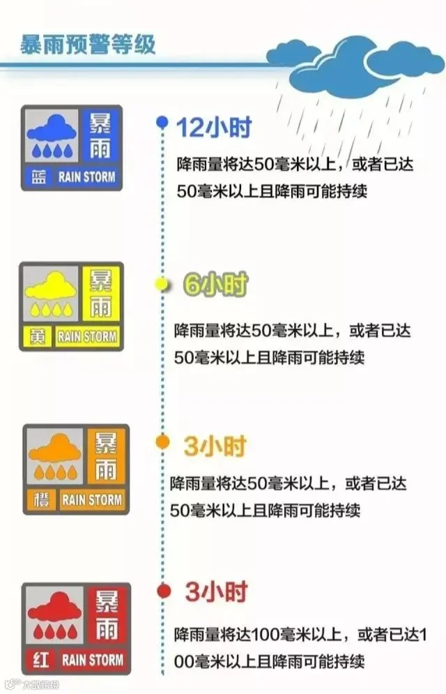 在出现暴雨天气时,当地气象部门会发布相应等级的暴雨预警信号,公众要密切关注暴雨预警信号的相关信息及对应的防御指南。