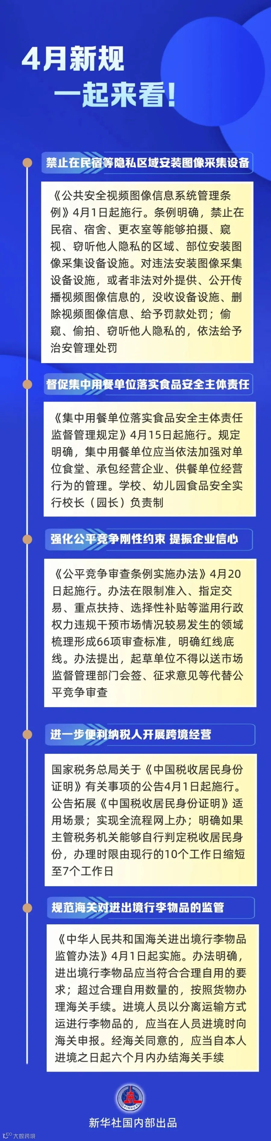 导读:4月新规,一起来看禁止在民宿等隐私区域安装图像采集设备;督促集中用餐单位落实食品安全主体责任;强化公平竞争刚性