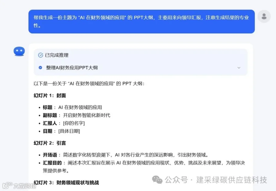 帮我生成一份主题为 “AI 在财务领域的应用”的 PPT,主要用来向领导汇报,注意生成结果的专业性。