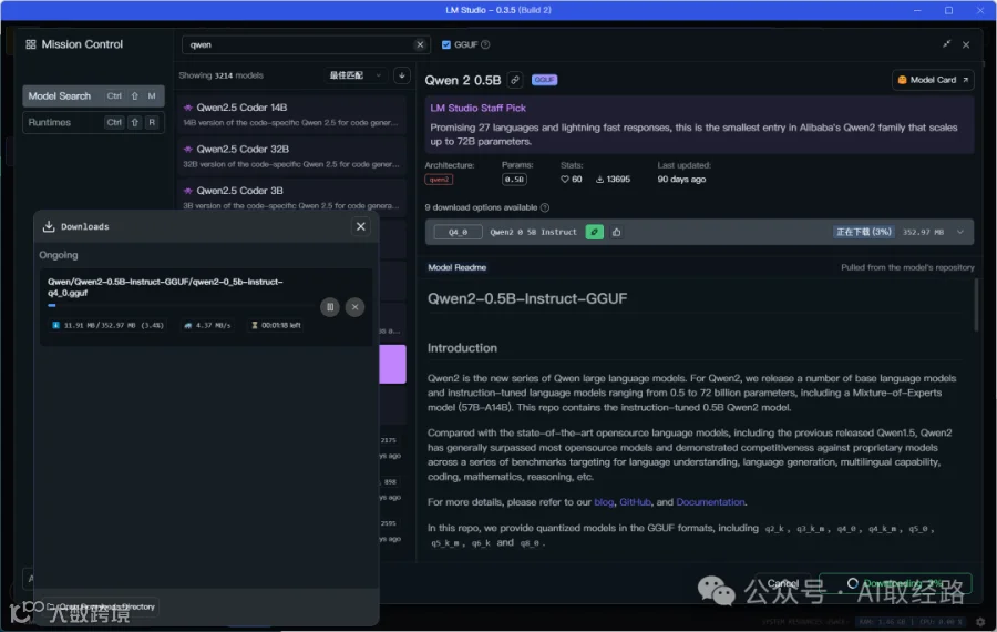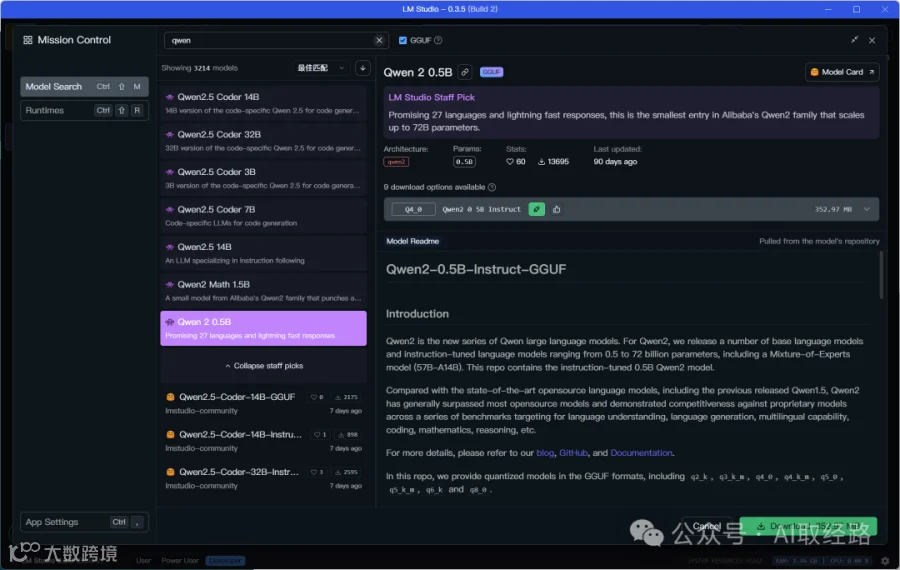 输入关键字,寻找想要下载的模型,这边找一下Qwen的模型,找到Qwen2 0.5B的模型,
