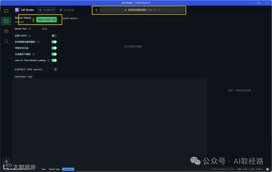 Server Port: 设置本地服务器使用的网络端口。默认情况下,LM Studio 使用端口 1234。如果该端口已被占用,您可能需要更改此设置