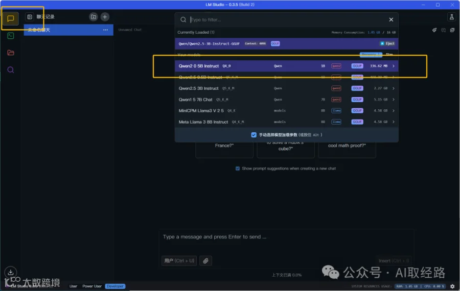 点击“聊天”页面,选择刚才下载的模型:Qwen2-0.5B-Instruct