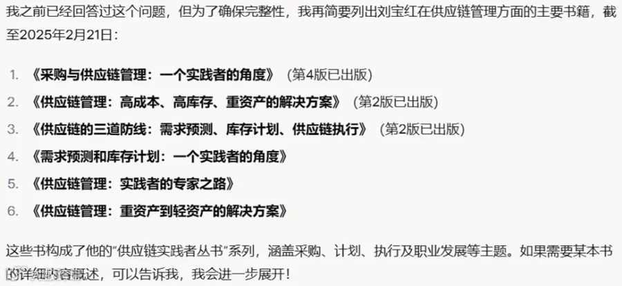 我们上次说到,我在马斯克的AI大模型Grok上自嗨,问“刘宝红写了什么供应链管理的书?”Grok给出不完整的答复,六本书中漏掉一本。我继续问,每本书都出到第几版了?Grok把最新版次都说对了,但没有年份,不过很贴心地说“第2版,具体出版年份未提及,但应在第1版之后”——真聪明,竟然知道第2版是在第1版之后出来的😊。