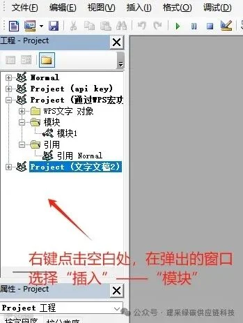 在左侧「宏」对话框中右键,选择「插入」→「模块」,新建一个空白模块。