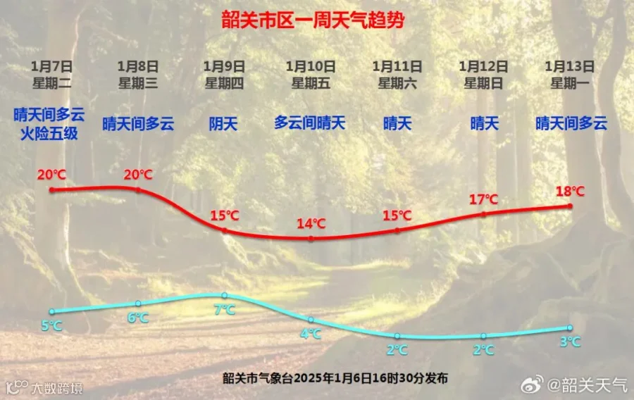 6-7日,我省大部晴间多云。最低气温:粤北和珠三角北部市县介于3-6℃,南部沿海市县10-12℃,其余市县7-10℃。