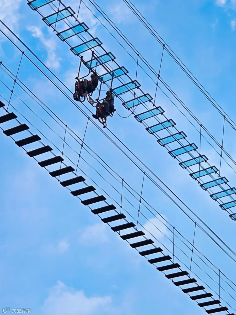 悬挂在空中的吊索宛如五线谱,横跨在蓝天与大地之间,游乐设施上的的人好似音符点缀在五线谱上,在蔚蓝的天幕上奏出一首勇敢、自由的音乐。