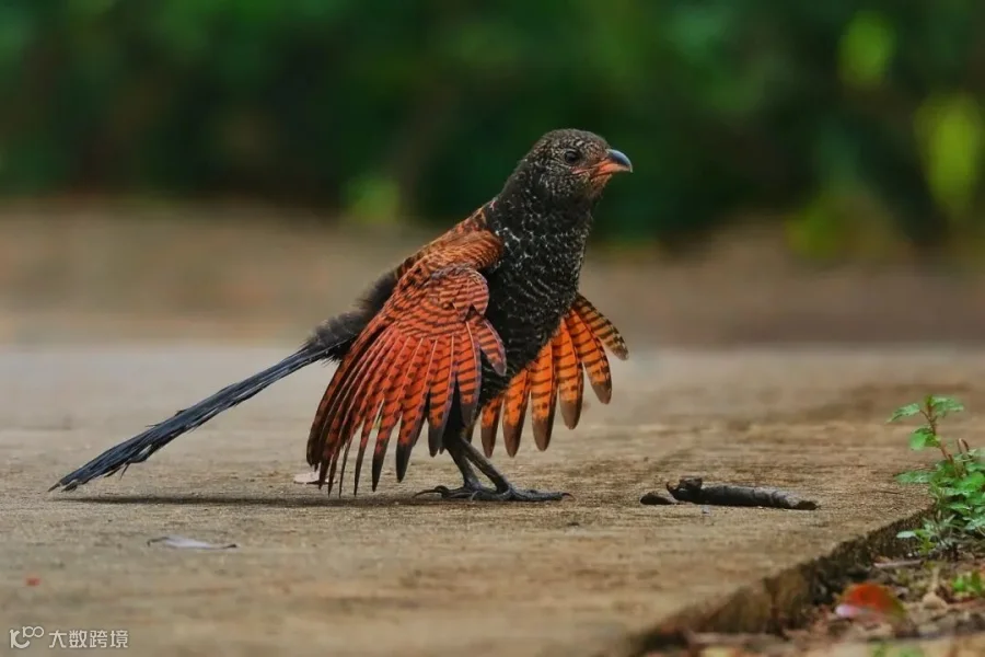 偶遇林间精灵,褐翅鸦鹃以其独有的华服,在绿意盎然中优雅驻足。黑红交织的羽翼,深蓝长尾如梦幻延伸,静谧注视间,尽显自然之魅。