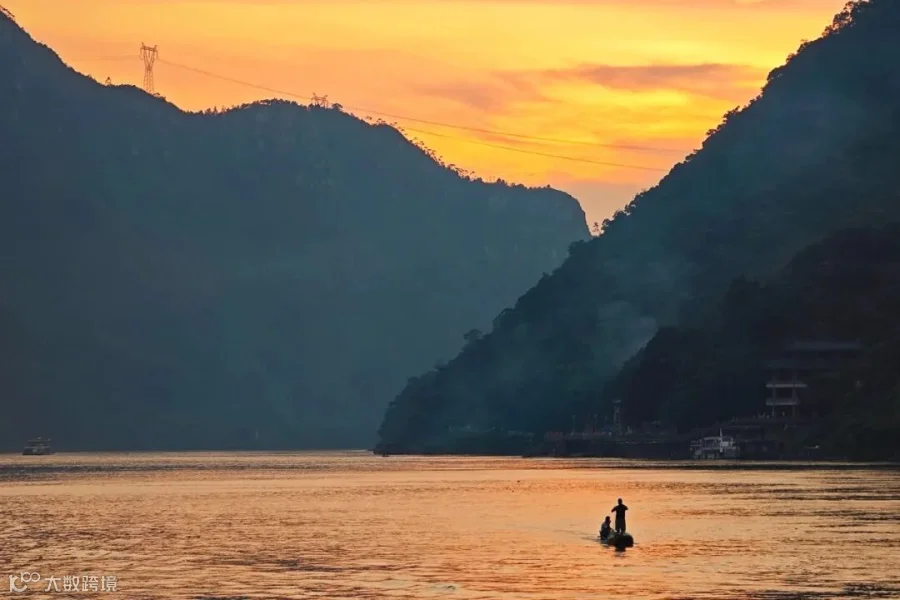 画面中的小舟,在夕阳的余晖中悠然前行,两座高耸的山峰,宛如守护的巨人,屹立在远方,它们的轮廓在夕阳的映照下,显得既坚毅又温柔。