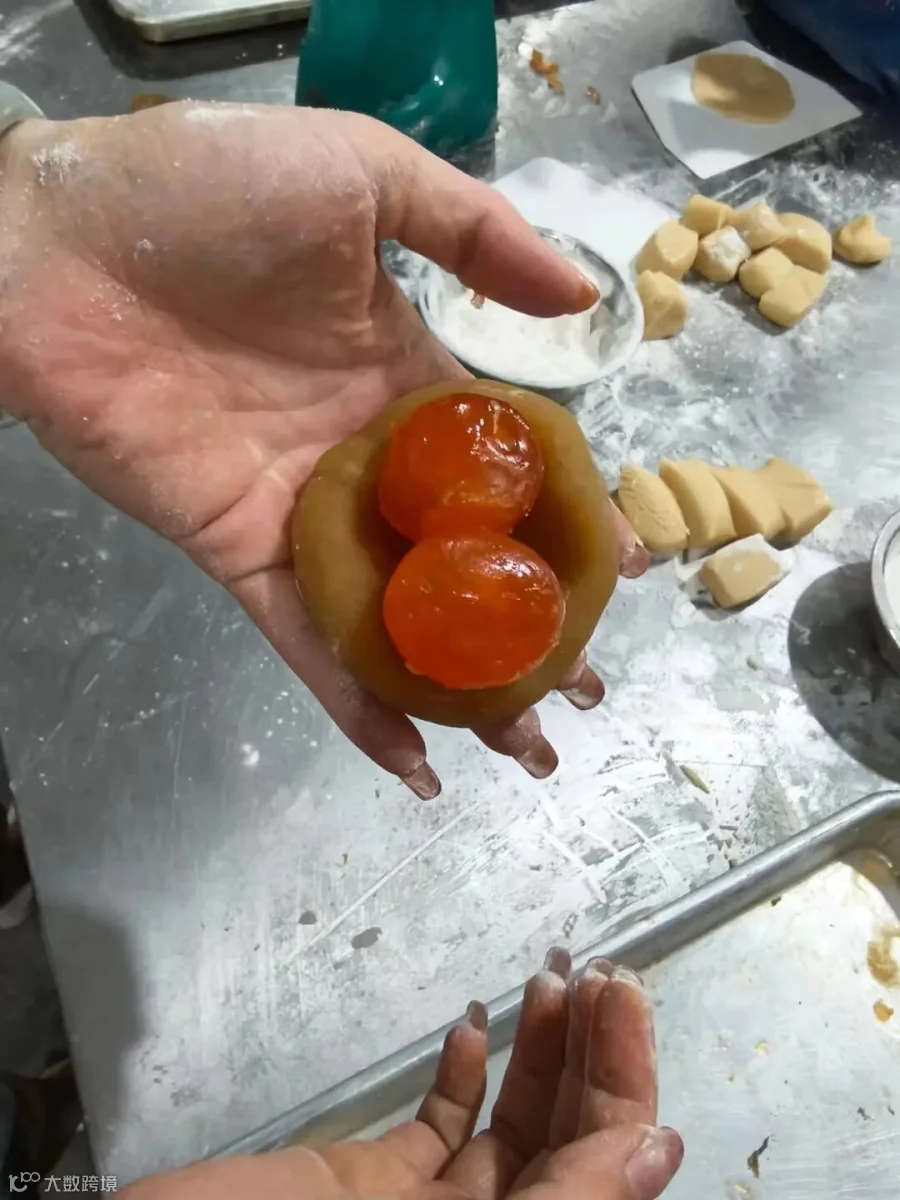 包馅的过程犹如一场指尖上的舞蹈,师傅们熟练地将馅料包裹在面团中,收口处细腻而均匀。古老的木制模具承载着岁月的痕迹,将包好馅的月饼放入模具中轻轻一压,一个带有传统图案的月饼便诞生了。