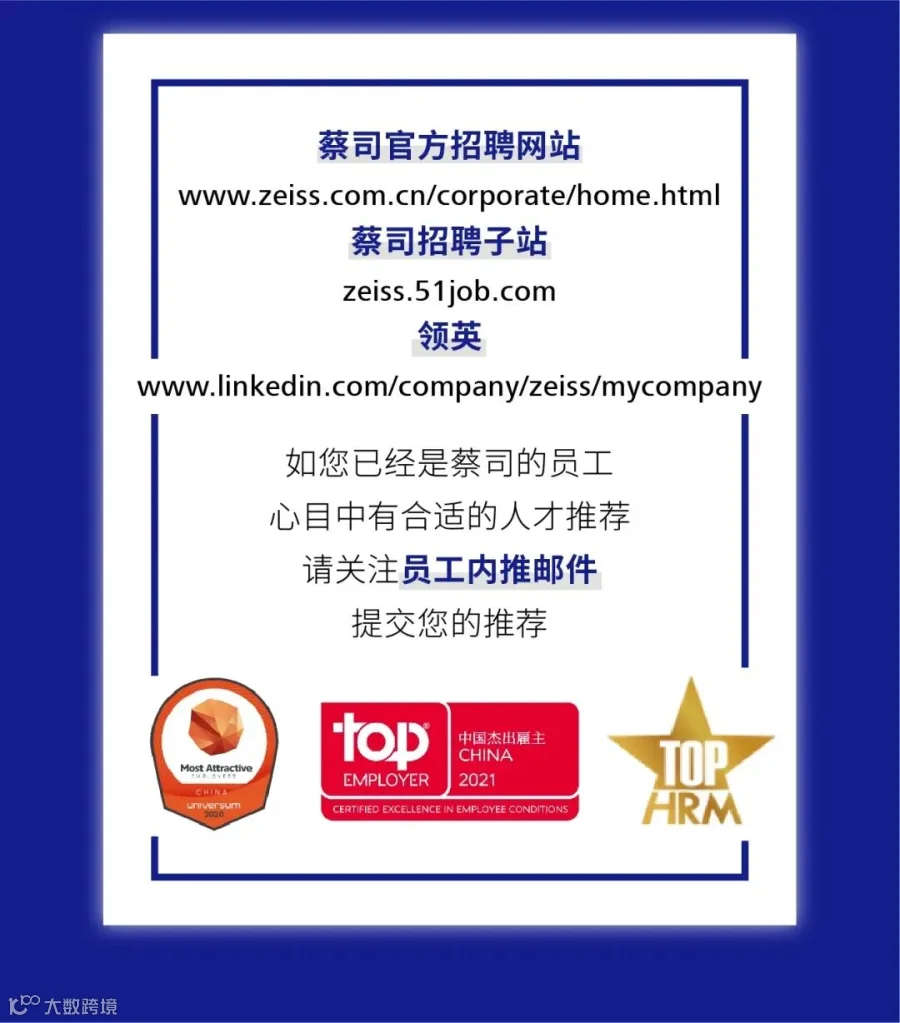 欢迎关注蔡司中国官方招聘账号!蔡司是全球光学和光电领域的技术先锋。蔡司在全球近50个国家共拥有约43,000名员工。公司于1846年在耶拿成立,总部位于德国奥伯科亨。在这里,您可以进一步了解蔡司中国的人才招募信息。加入我们,体验非凡机遇!
