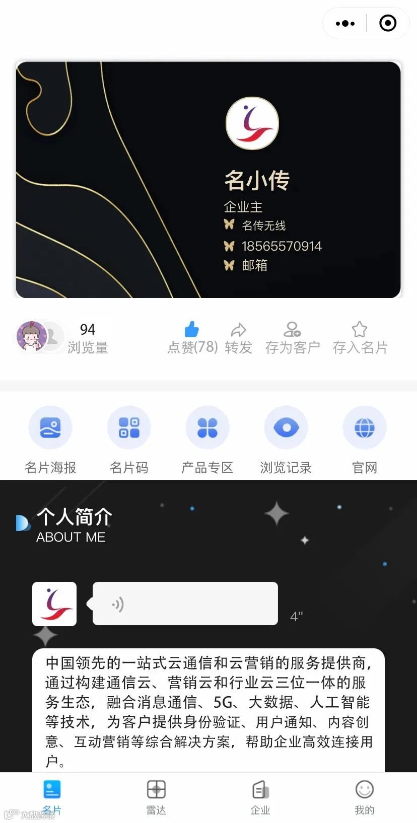 为每个营销人员打造一张科技范的智能云名片,全方位展示公司实力和产品优势