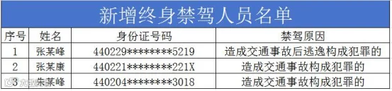 此次公布的终生禁驾人员共有3人,禁驾原因为造成交通事故后逃逸构成犯罪或造成交通事故构成犯罪。