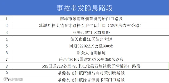 韶关市道安办曝光事故多发隐患路段10处,事故多发路段系由公安交管部门综合分析路段事故量、死亡人数、受伤人数、亡人事故量等因素得出。
