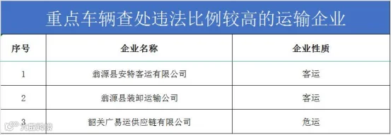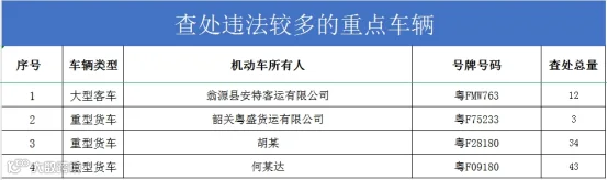 本次曝光违法次数较多的重点车辆包括:何某达名下的重型货车粤F09180、胡某名下的重型货车粤F28180、翁源县安特客运有限公司的粤FMW763、韶关粤盛货运有限公司的粤F75233等。上述车辆单月违法次数较多。