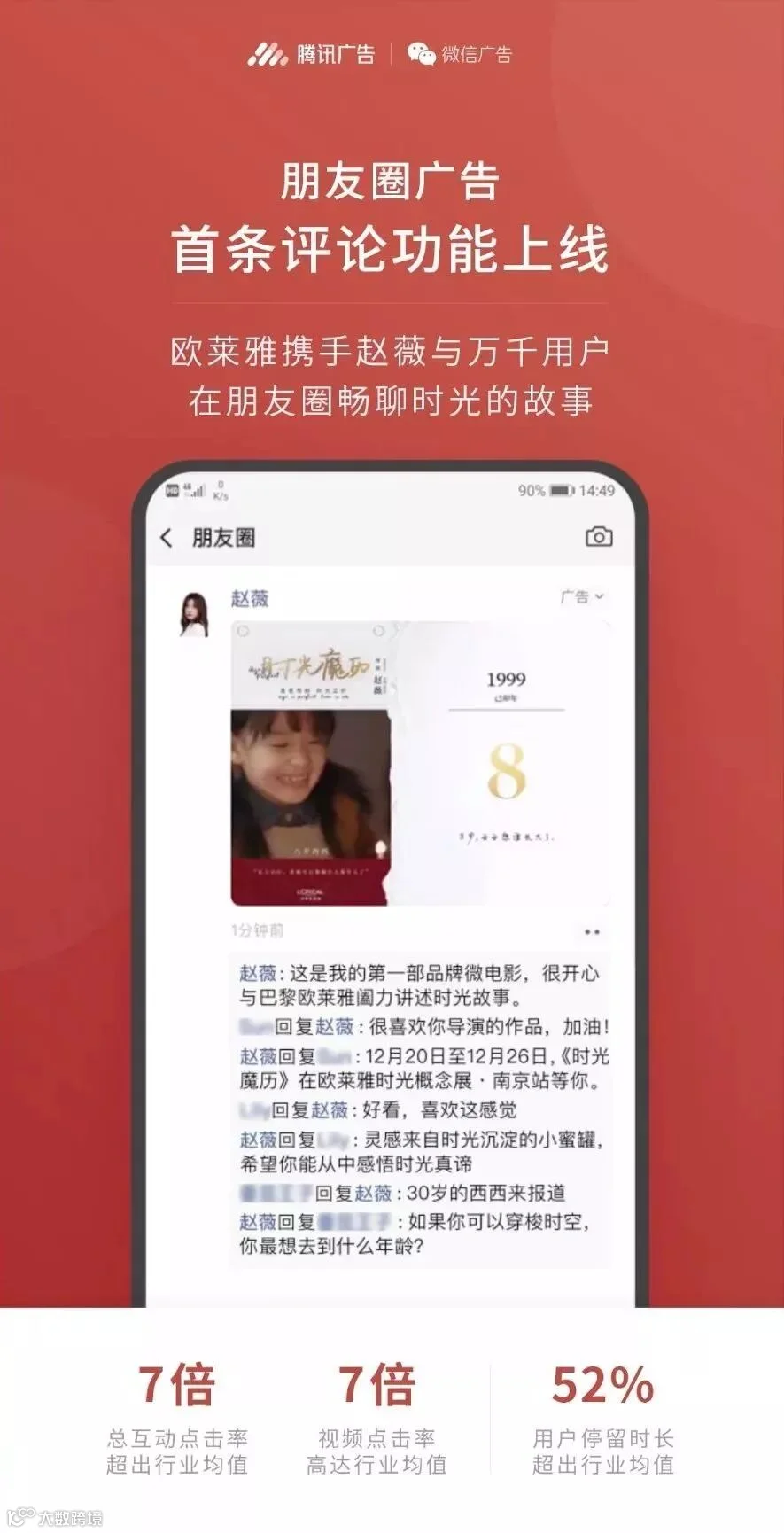 像这条巴黎欧莱雅的广告,在赵薇发出首条评论后,视频点击率达到行业均值的7倍,停留时长超出行业均值52%,广告总互动点击率也超出行业均值7倍。