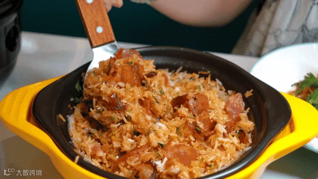 经典腊味煲仔饭,揭盖就闻到浓郁的腊肉香气,经过搅拌,粒粒饱满亮油的米粒渗透着酱料的鲜味和腊味香,入口香气四溢。