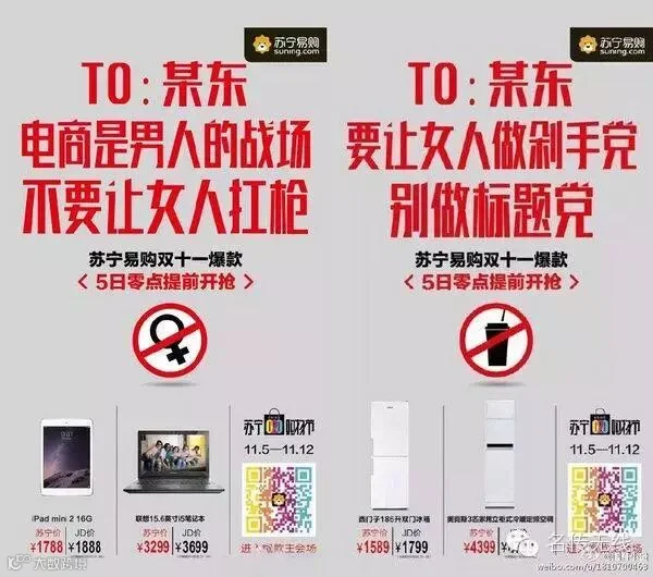 估计昨天大家的朋友圈都被苏宁和京东的这组扯逼广告给刷屏了。