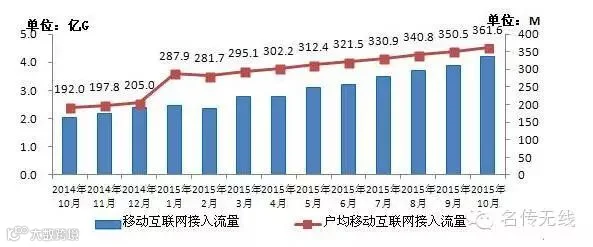 而在工信部发布的《2015年10月份通信业经济运行情况》,截止2015年10月,中国移动互联网用户已突破9.5亿。全国用户移动流量数据累计达32.1亿GB,月户均移动互联网接入流量达到361.6MB,连续10月实现翻倍增长。