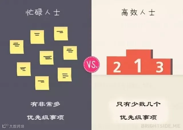 《Brightside》通过比较和分析,列举了13个忙碌人士和高效人士的不同点,帮助大家正确定义忙碌和高效。