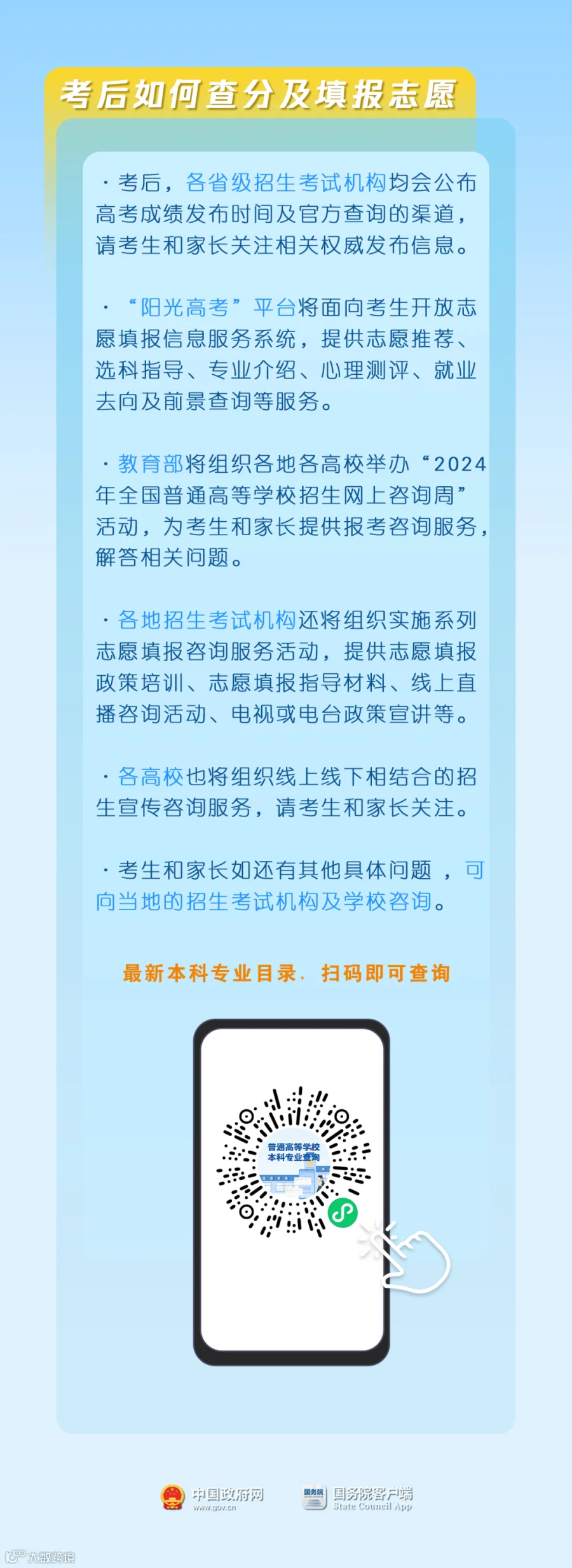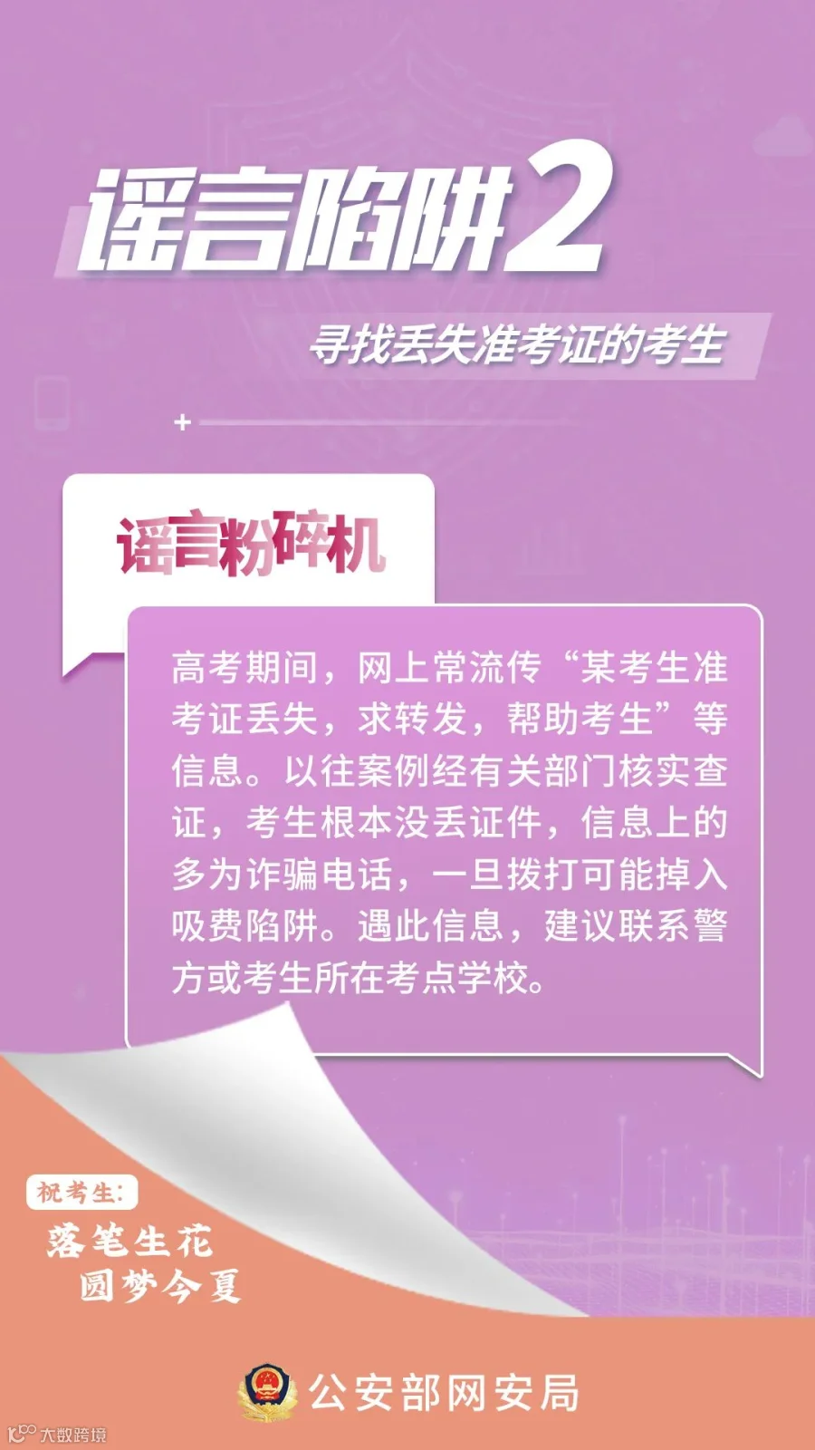 要密切关注成绩公布、填报志愿等重要信息,特别是有意报考军队和公安等特殊类型院校的考生,要特别留意体检、面试和政治考核的信息,及时提交资料,以免错过时间。时刻注意保护个人信息,不在微信朋友圈等网络平台晒个人证件等信息。高考招录遇到疑难问题,请及时咨询班主任或教育、招生部门,不要相信“内部指标”“低分高录”“补录”等骗子说辞。