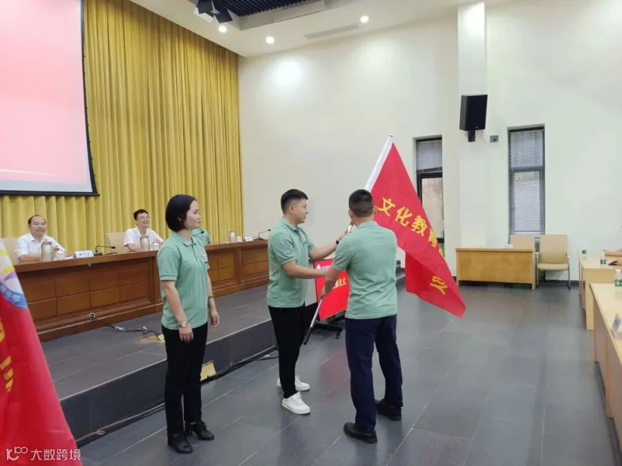 会长陈胜华为法律财税服务队队长戴飞霞、文化教育服务队队长陈辉授旗。