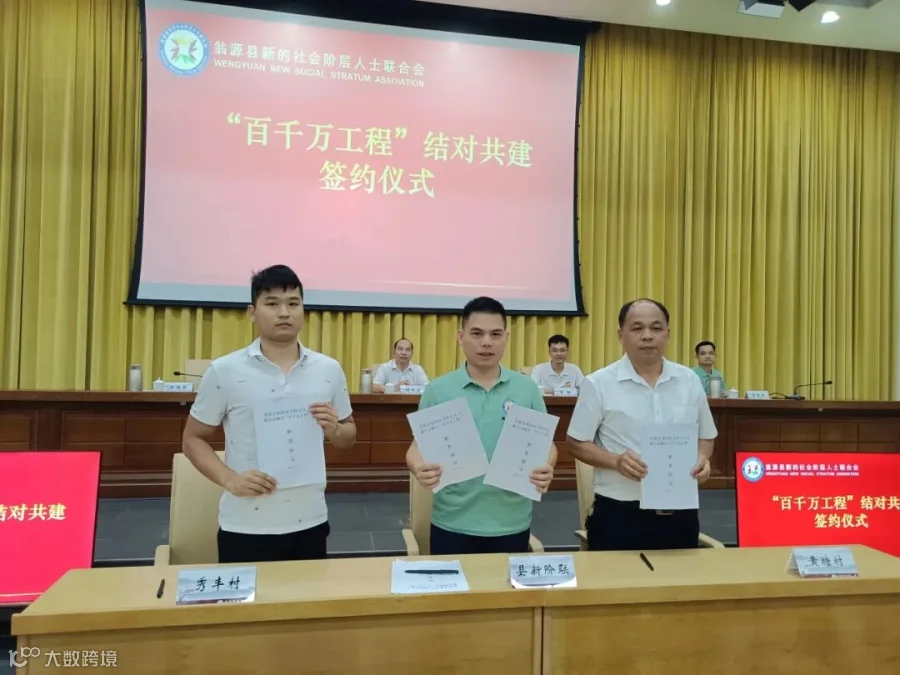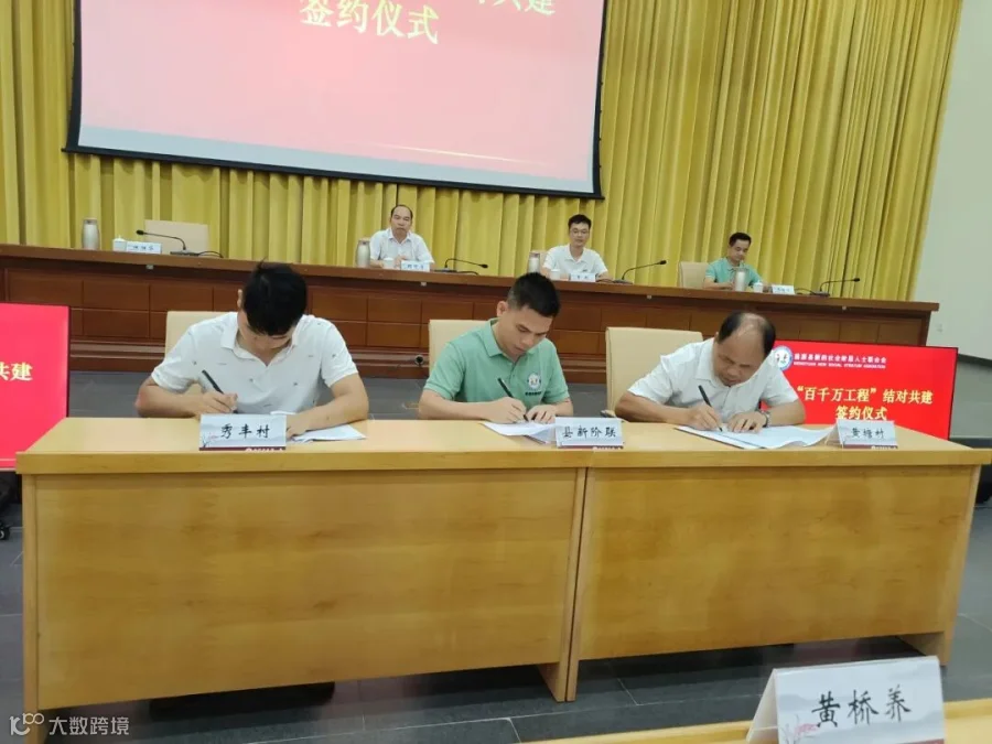 新阶联会长陈胜华、黄塘村支书黄桥养、秀丰村支书王日华上台,共同签署“百千万工程”结对共建协议。