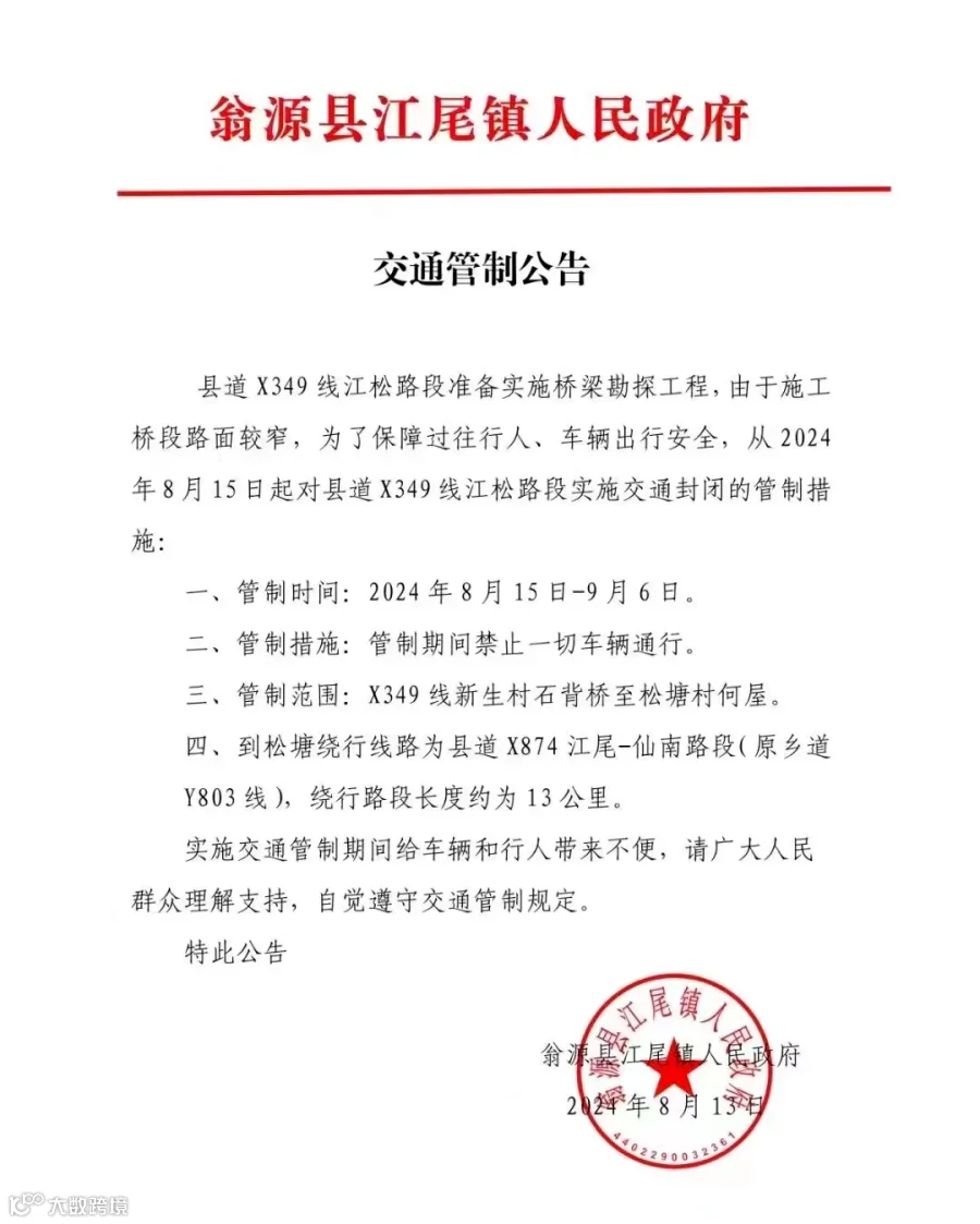 据了解,该桥梁是连接江尾与松塘的重要交通枢纽,日常交通流量较大。为确保施工期间的安全和工程质量,相关部门决定对该路段实行交通管制。