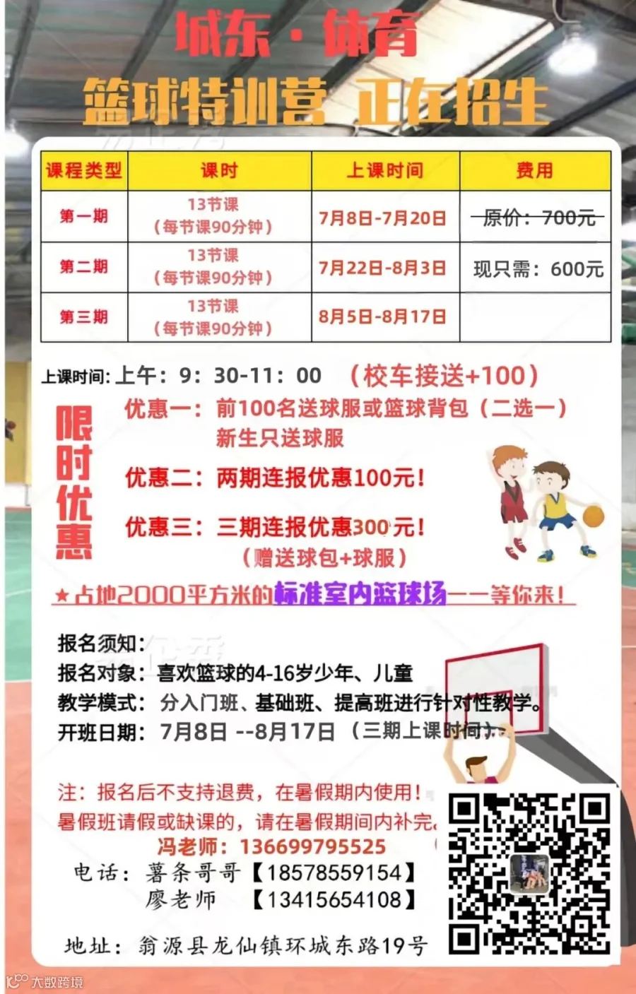 城东体育篮球暑假班七月八号要开课啦!拥有专业的教练,室内的篮球场。分幼儿班、基础班、提升班,(赠送球服,可校车接送,暑假让小孩远离手机,运动起来🏀。丰富孩子们的暑期生活,培养多方面兴趣,让他们自身素质得到提升!有需要的抓紧扫描二维码联系吧.