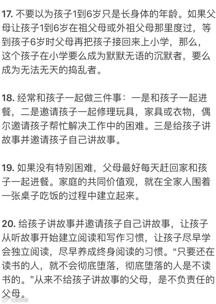 08. 父母需要承担教育孩子的责任,不过,也不要因为教育孩子而完全取消了自己的休闲生活。“没有责任感伤害别人,太有责任感伤害自己。”