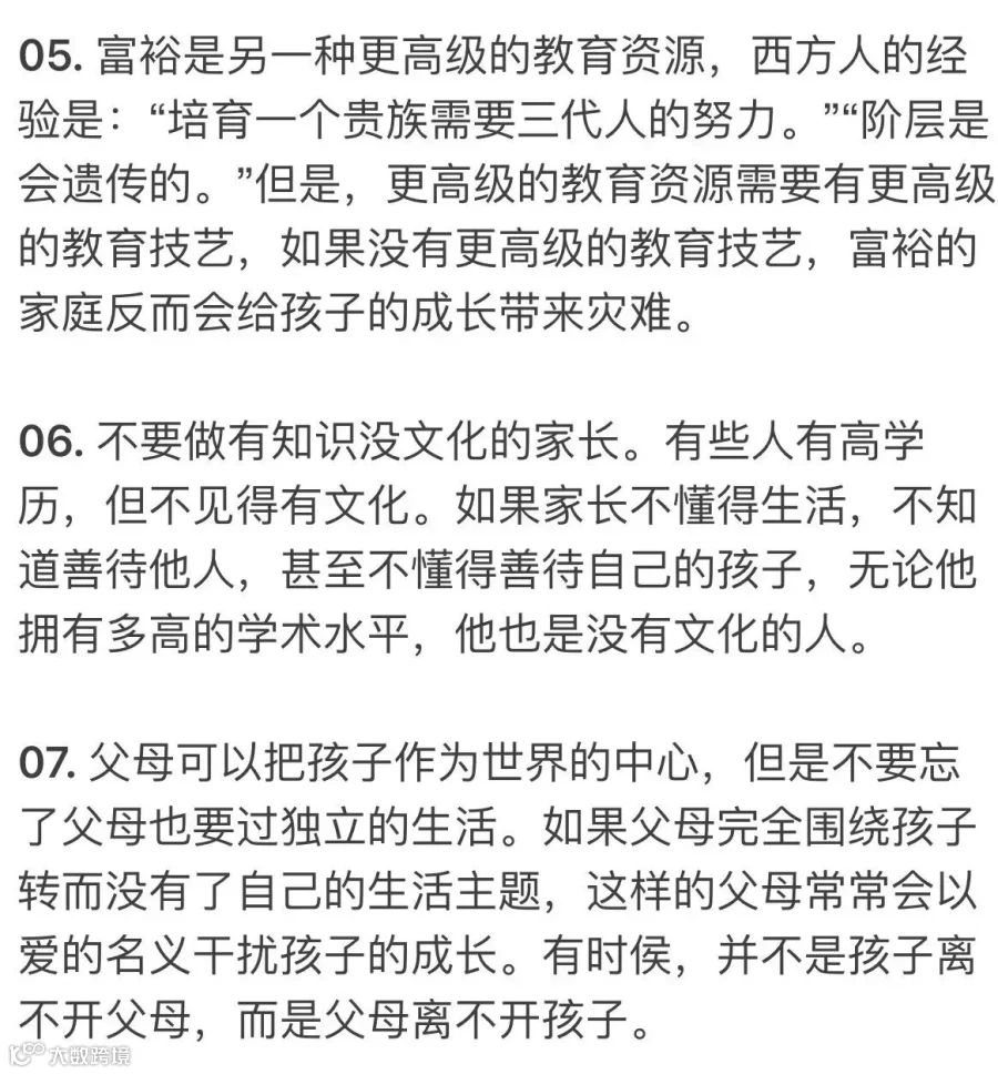 12. 有修养的父母是“伏尔泰主义者”,“我不同意你的观点,但我誓死捍卫你说话的权利”。他们从孩子出生的那天就开始跟孩子讲道理,耐心的征求孩子的意见。不要指望打骂孩子就能让孩子学会服从。杀鸡给猴看的结果是:猴子也学会了杀鸡。