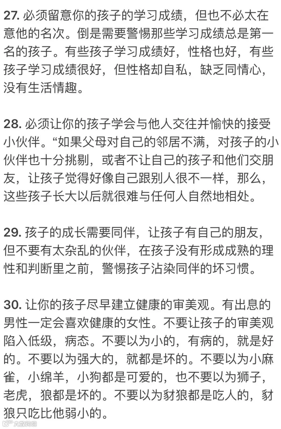 26. 在孩子3岁前后,他的身边最好有一个无为的放任型父母。在孩子9岁前后,他的身边最好有一个积极的权威型父母。在孩子13岁前后,他的身边最好有个消极的民主型父母。有效的教育是先严后松,无效的教育是先松后严。
