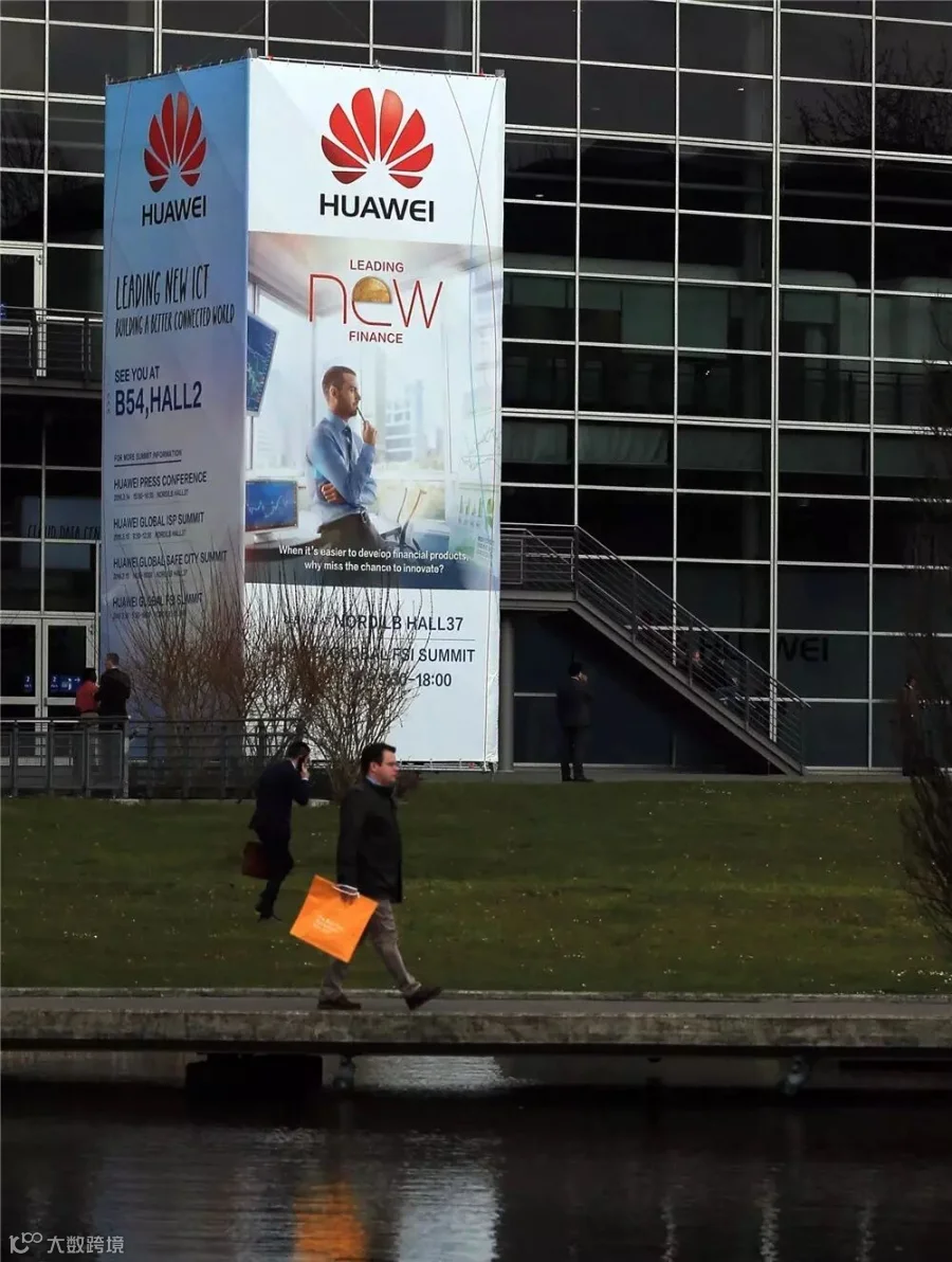 2016年3月16日,人们在德国汉诺威IT展上经过中国华为公司的室外广告宣传立柱。新华社记者 罗欢欢 摄