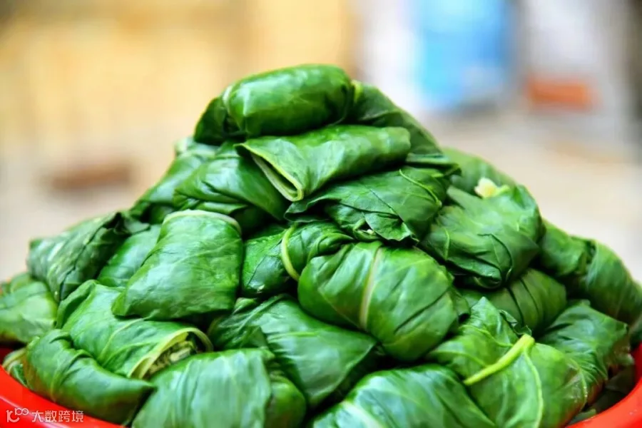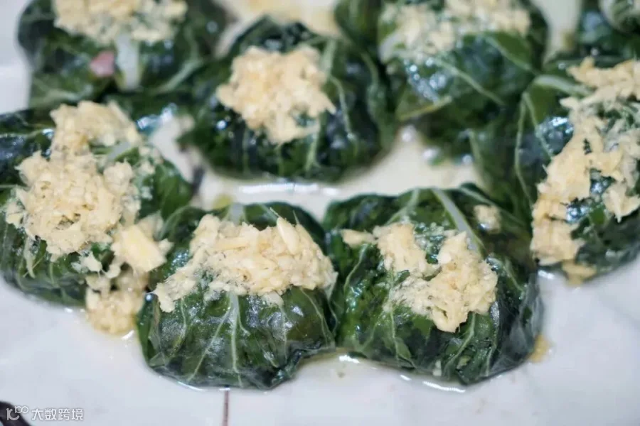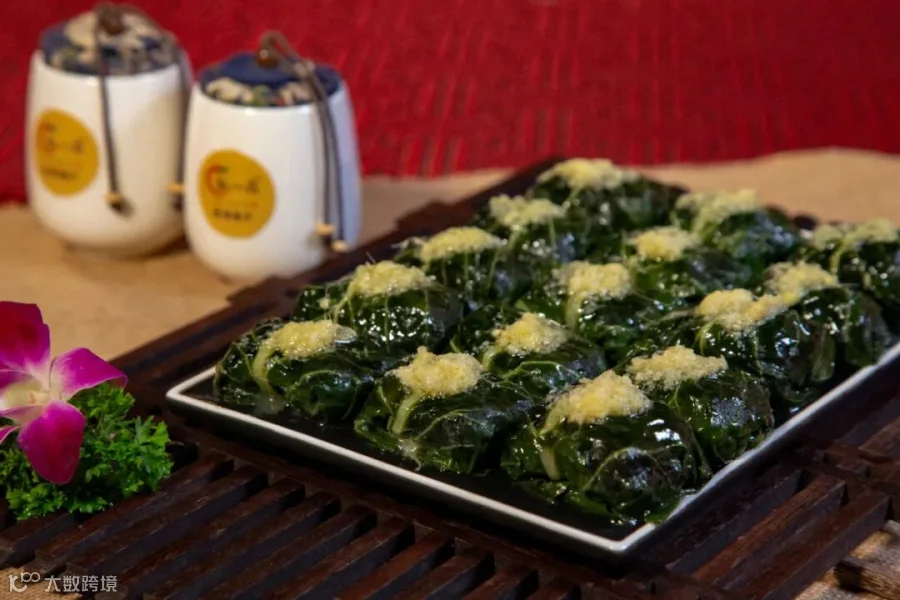酿菜包是纯手工制作而成的,采用农家金叶菜,馅是用农家韭菜、薯粉、猪肉混合一起做成的。先把整片的金叶菜用开水煮一下,然后把调制的馅包在用开水烫过的金叶菜里,最后把菜包摆放在锅里加水慢慢熏熟。