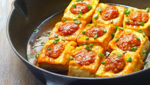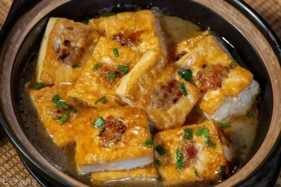 在火柴盒大小的水豆腐上挖个小洞,然后把猪肉和葱做成的馅“酿”入其中,放到锅里慢慢焖,最后洒上葱花,一道美味的客家酿豆腐就做成啦。客家酿豆腐,是翁源客家人的名菜。在客家人的生活中,但凡有宴席必有此道菜。翁源的客家酿豆腐,因使用的水和豆制品不一样,酿出来的豆腐韧而爽口,清甜中带有嚼劲。翁源的酿豆腐馅多种多样,有韭菜、香菇肉馅及其他。