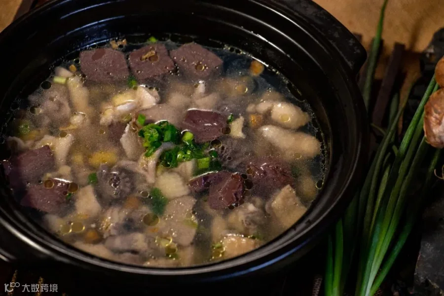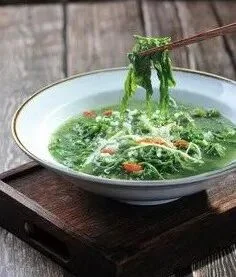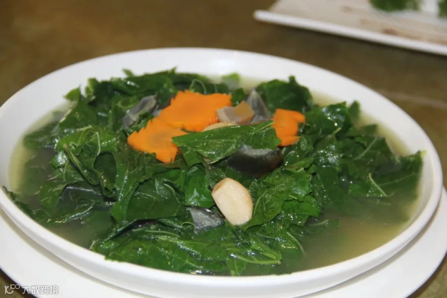 上汤桑叶尾是地道翁源农家菜,看似简单,却大有乾坤。摘取桑叶顶端最嫩的部分,皮蛋切丁,大蒜剁碎或压泥,蘑菇、胡萝卜切片。再经过大火油烧、清水煮开等步骤才能上桌成为美味。
