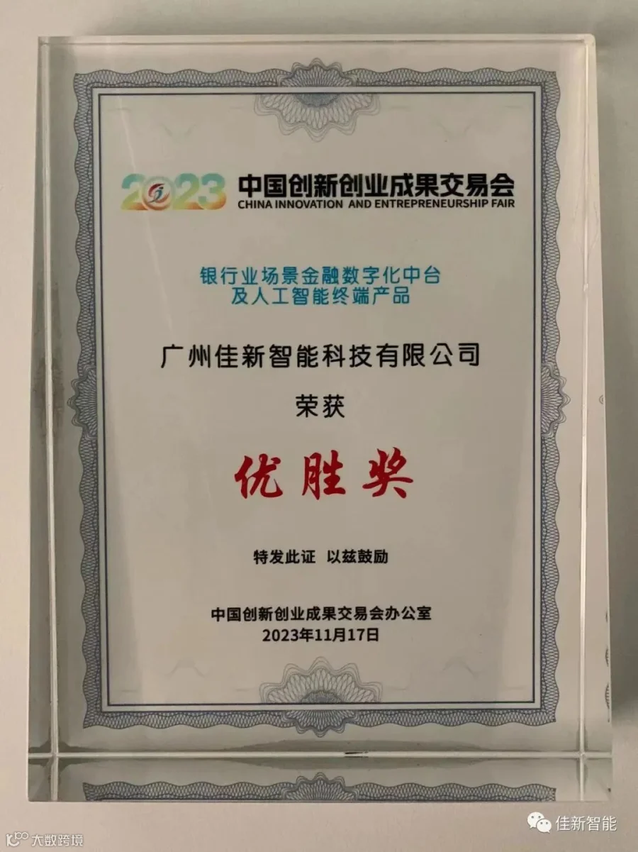 11月10日,由中国创新创业成果交易会办公室、广州市科学技术协会、广州市南山自然科学学术交流基金会、广州市合力科普基金会主办的“科创未来,乐业湾区”2023中国创新创业成果交易会首届中国创交会创新创业大赛决赛在广州成功举行!此次大赛主要分为三大综合赛道,以人工智能&新一代信息技术,生物医药&农业科技/食品科技,新能源/新材料/节能环保&其他领域三大综合赛道进行比拼,对参赛企业科技成果要求高。经过激烈角逐,佳新智能在人工智能&新一代信息技术赛道斩获优胜奖,这个奖项是对佳新智能的高度认可,印证了市场、资本和专家们对佳新智能在银行业场景金融数字化中台及人工智能终端产品应用成果和价值的信心与肯定。