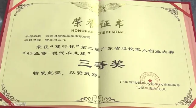 据悉,在2020年,由省退役军人事务厅举办的“戎归南粤谱新篇 创业圆梦大湾区”第二届退役军人就业创业大赛中,张作添的紫苏鸡项目从421个项目中脱颖而出,荣获“现代农业”行业三等奖的好成绩。