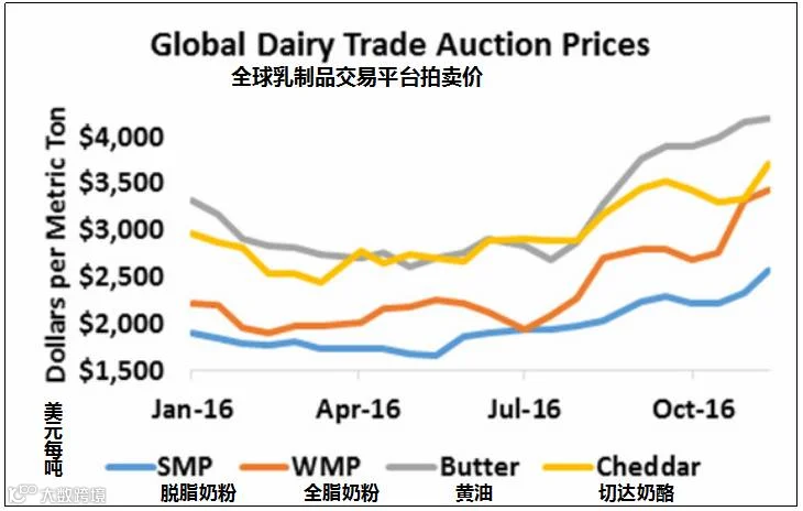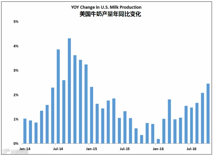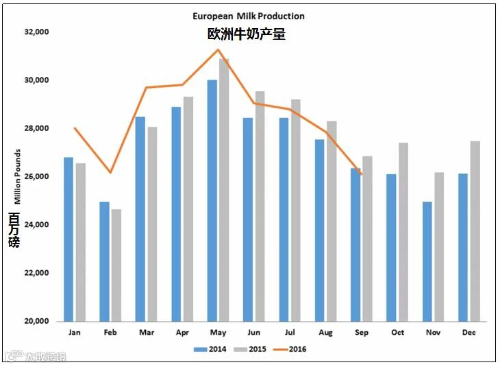 最近的乳品价格波动无疑是基于海外牛奶产量下降的消息,希望这种情况能持续下去。据初步的并经常要修订的欧洲数据显示,9月份的牛奶收集量较去年同期下跌2.8%,是自2015年1月以来最大跌幅,可能是因为当时部分国家的生产商为了避免超额处罚而实施减产。德国的产量下跌3%,法国下跌7.3%,英国下跌8.2%。而在荷兰,虽然9月份的牛奶产量比去年同期涨幅3.9% ,10月份涨幅2%,但明显小于整个夏季近5%的涨幅。