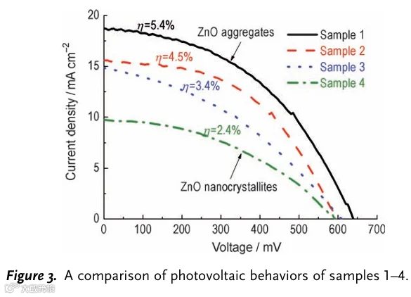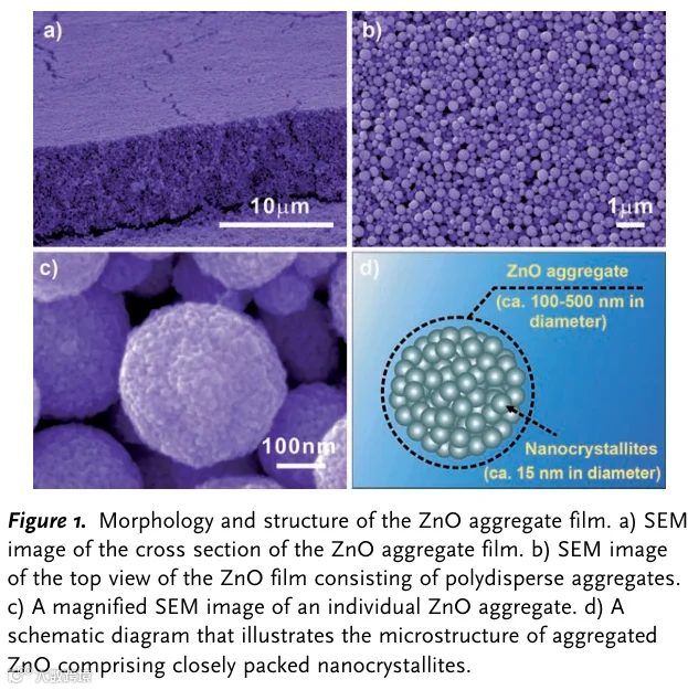 美国华盛顿大学进行了一项研究,旨在提升染料敏化太阳能电池的光电转换效率。研究人员合成了一种具有特殊分级结构的氧化锌薄膜:由约15nm的微小氧化锌晶粒,聚集形成亚微米尺寸的二次球体。通过调控合成条件,他们制备了从“完美多分散聚集体”到“完全分散的纳米晶”等一系列不同形貌的薄膜,并组装成电池进行测试。