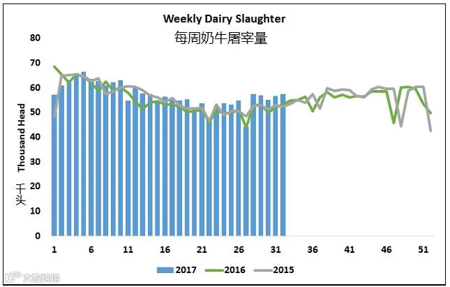 奶牛屠宰量仍在升高。截止至8月12日当周,奶牛的屠宰量为57,318头,与去年同期相比涨幅7.5%。到目前为止,奶牛屠宰量比2016年高出3.5%。