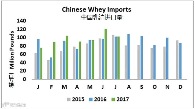 中国六月份对奶粉的需求突出,而七月的需求依然强劲。今年七月,中国进口5790万磅脱脂奶粉(SMP),是2016年7月的两倍,也是本月以来的最大进口量。与六月高企的进口量相比,全脂奶粉(WMP)的进口量有所下滑,但仍然达到8850万磅,与去年相比涨幅65%。迄今为止,今年中国脱脂奶粉(SMP)与2016年的前七个月相比涨幅25.5%,全脂奶粉(WMP)涨幅6.2%。