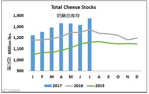 美国农业部报告指出,截止至7月31日奶酪的库存达到13.8亿磅,与去年同期相比涨幅7.8%,与上个月相比增长5840万磅。这是近数十年来最大的单月增长,这个增长击碎了由五月和六月奶酪库存轻微下降所带来的希望,似乎表明需求仍未能跟上积极的奶酪生产增长的步伐。