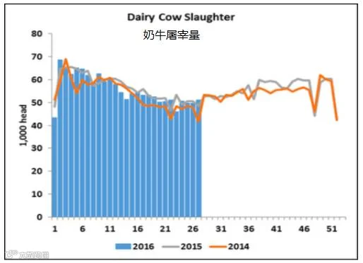本周截至7月2日,奶牛屠宰量总计为51,216头,比去年同期增长了5.6%。然而,这个年差距与实际有点偏差,因为去年的美国独立日(每年的7月4日)那周不同于本周。今年至今,奶牛屠宰量比2015年下跌1.2%。