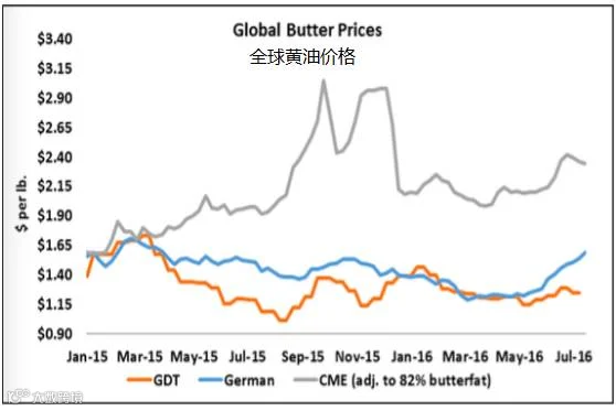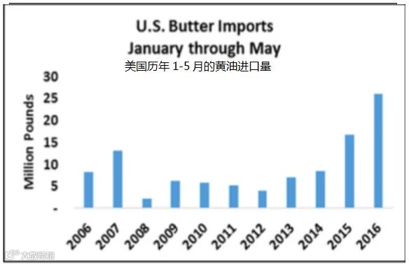 同样,德国黄油市场价格跃升至3,225欧元/吨的均价,是自2015年3月以来的最高价。本周,芝加哥商品交易所现货黄油价格上涨3.75美分,达到2.32美元/磅。调整汇率和乳脂差价后,相对欧洲黄油,芝加哥商品交易所的黄油持有75美分的溢价。这一价格差距大得足以使更多的黄油进口到美国,然而这只是自今年1月以来美国和欧洲黄油市场差价中最小的差距。人们不感到意外的是1月至5月的美国黄油累计进口量创下最大纪录。